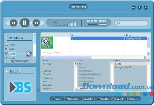 Về bản chất, BS.Player Free là một trình phát Windows Player hỗ trợ phát mọi định dạng file nhạc và chuyên về video, divx playback. BS.Player Free cũng có sẵn những skin phù hợp với mọi người. BS.Player 2.63.1071 không chỉ là một trình nghe nhạc bình thường mà nó còn giúp bạn quản lý những files đa phương tiện (multimedia content) hiệu quả. Bạn có thể phân loại từng phần ở playlist nhanh hơn và dễ dàng hơn. Playlist có thể được tạo thông qua BS.MediaLibrary module hoặc trực tiếp qua BS. Điều cuối cùng và cũng là quan trọng nhất, BS là sản phẩm mang tính cộng đồng cao nên nó được trang bị một kho phụ đề đồ sộ với nhiều tùy chọn ngôn ngữ cho mọi khách hàng trên thế giới.