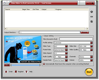 Plato Video to iPod Converter là chương trình lý tưởng dành cho mọi người. Nó cho phép bạn chuyển đổi hầu hết định dạng video như rm, divx, xvid, avi, wmv, asf, mpg, mpeg, vob, mov, qt, mp4, 3gp, swf, nsv to Apple iPod /iPhone /Apple TV mp4 video.